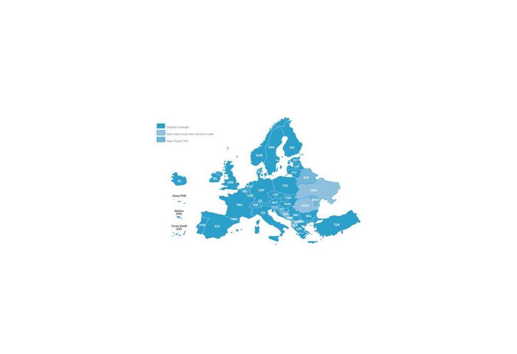 Includes more than 10 million km (6.2 million mi) of roads, including motorways, national and regional thoroughfares and local roads, in Western Europe and many countries in Eastern Europe.