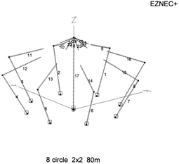 My location was especially chosen with Amateur radio in mind and you will see from the pictures that space is almost unlimited. The antennas currently in use are two 90 foot top loaded 160m verticals, 80m is covered by an 8 element vertical array – this being difficult to photograph I have shown an Eznec model – 8 directions each 45 degrees with a takeoff angle of 20 degrees – the antenna was designed by G3LNP originally for 40m and with Tony’s help I scaled it up for 80m, moving onto 40m with a 2 element Optibeam at 100 feet and a 40m four square – the higher bands are covered using a Tennadyne T10 Log Period at 70 feet. For local contacts I use a full size Carolina Windom at 70 feet and covers 160-10m.