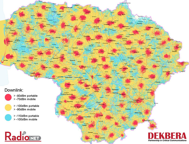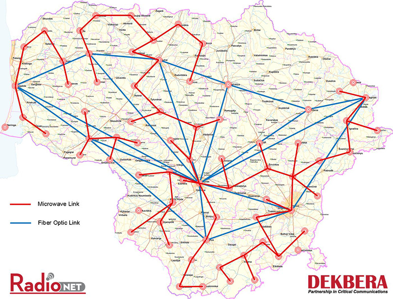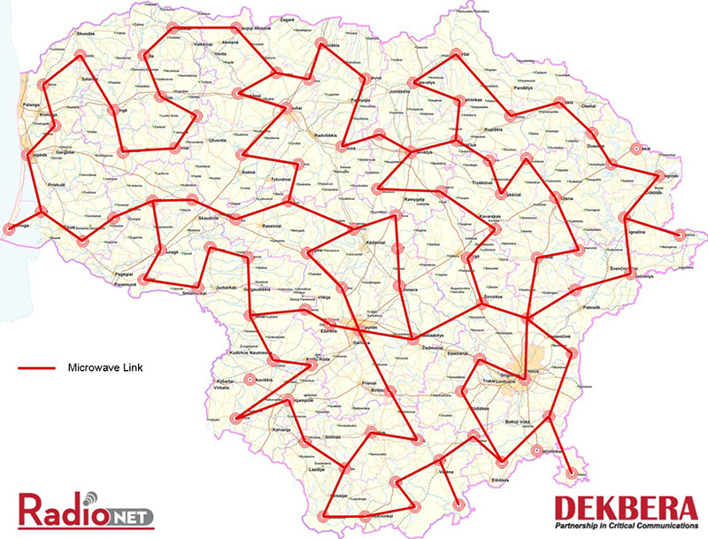 The Dekbera RadioNET network has five stages of implementation. The first stage was fully finished in Spring 2012 and covered the largest (by population) Vilnius region, which has 10 sites and 22 channels. The second stage was completed in the beginning of 2013 and its task was to cover the second largest (by population) central region of Lithuania, which has 16 sites and 39 channels. The second stage includes coverage in the 5 largest cities. The third stage was implemented in the middle of autumn 2013 and covered the regions around the 5 largest cities of Lithuania. The third stage expanded the RadioNET system by 22 sites and 44 channels. By the end of the third stage RadioNET had reached its 48 sites limit, which is the maximum in the first generation of NEXEDGE network technology. Before implementing the fourth stage KENWOOD engineers developed a special system bridge, which allows the end user to connect further NEXEDGE trunking systems. Special firmware was also developed for the radios which allow automatic roaming between two different networks. The fourth stage of implementation was started in December 2013 and will be finished by September 2014. It has three tasks: to cover the 10 largest cities of Lithuania, to in-fill some “network coverage holes” and to expand system capacity. According to the expansion plans for the fourth stage, an additional 27 sites and 70 channels will be installed. As of the end of January 2014 there were 8 sites installed and now the system has 56 sites and 125 channels in total. Currently RadioNET is the biggest NEXEDGE trunking system network in Europe and the biggest network in the world created by a single owner /network provider. The fifth stage should cover the rest of the country, fully in-fill any remaining “network coverage holes” from previous stages and expand the system capacity. The last stage of implementation is planned for 2015 and will add approximately 25 more sites and 75 – 100 channels. In total, RadioNET will have approximately 100 sites and more than 300 channels.