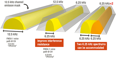 The NXDN™ air interface is capable of fitting into both narrow 12.5 kHz and very narrow 6.25 kHz bandwidth channels. As well as meeting the tightest of spectrum efficiency requirements (occupied bandwidth: 9600 bps @ 8.3 kHz and 4800 bps @ 4 kHz, respectively), this exceeds all regulatory and emissions mask requirements in all bands.